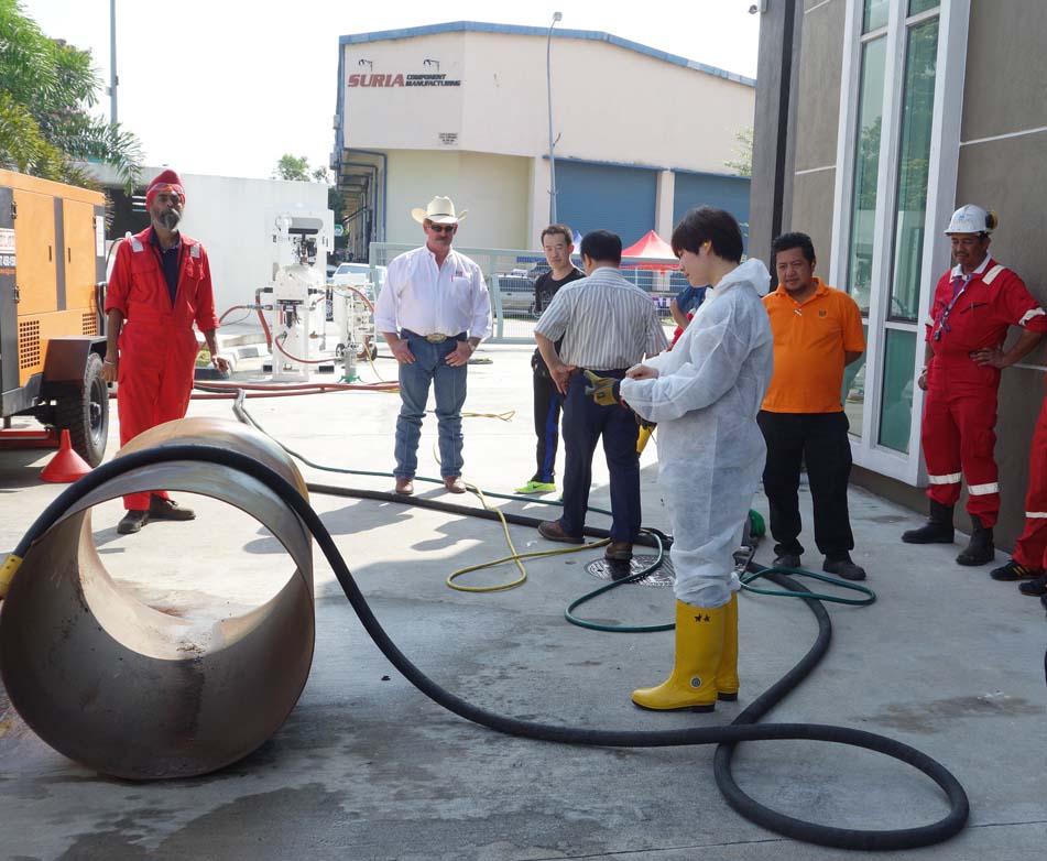 期間,系統學習了石榴石的噴砂技術要領、了解了各種新型的噴砂設備、部件及使用方法,進行了RZG石榴石噴砂磨料同澳大利亞石榴石、印度石榴石的實際噴砂對比,進行了RZG石榴石噴砂磨料同銅渣(也叫銅礦砂)的實際噴砂對比。